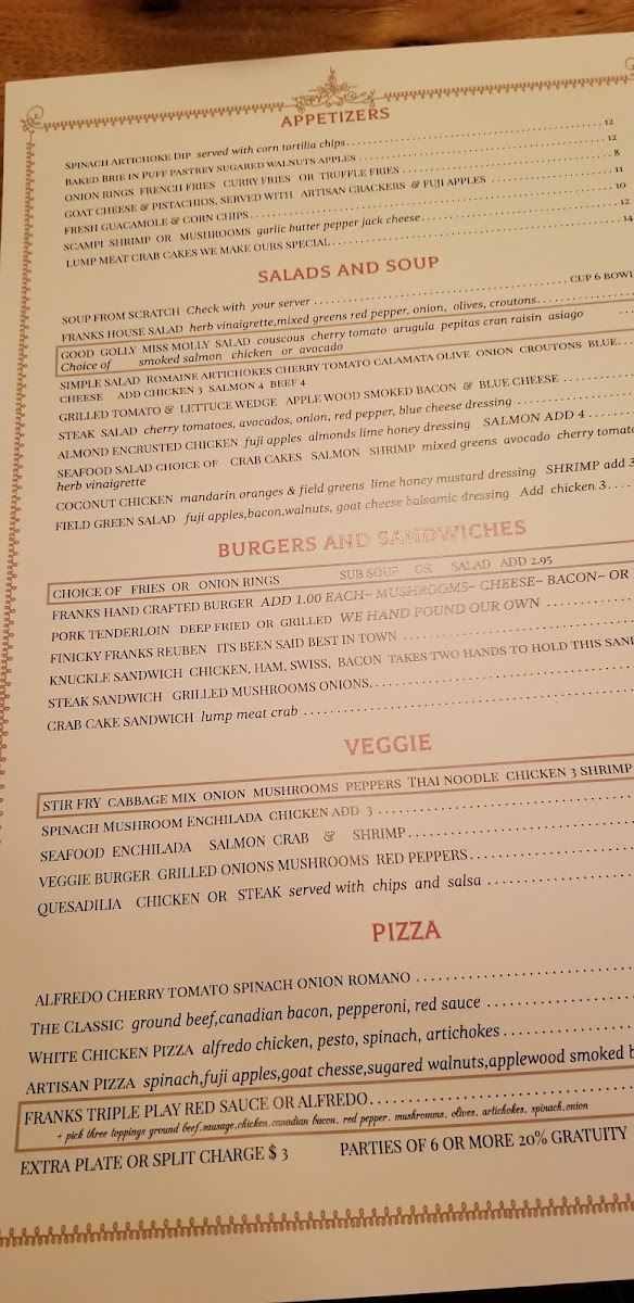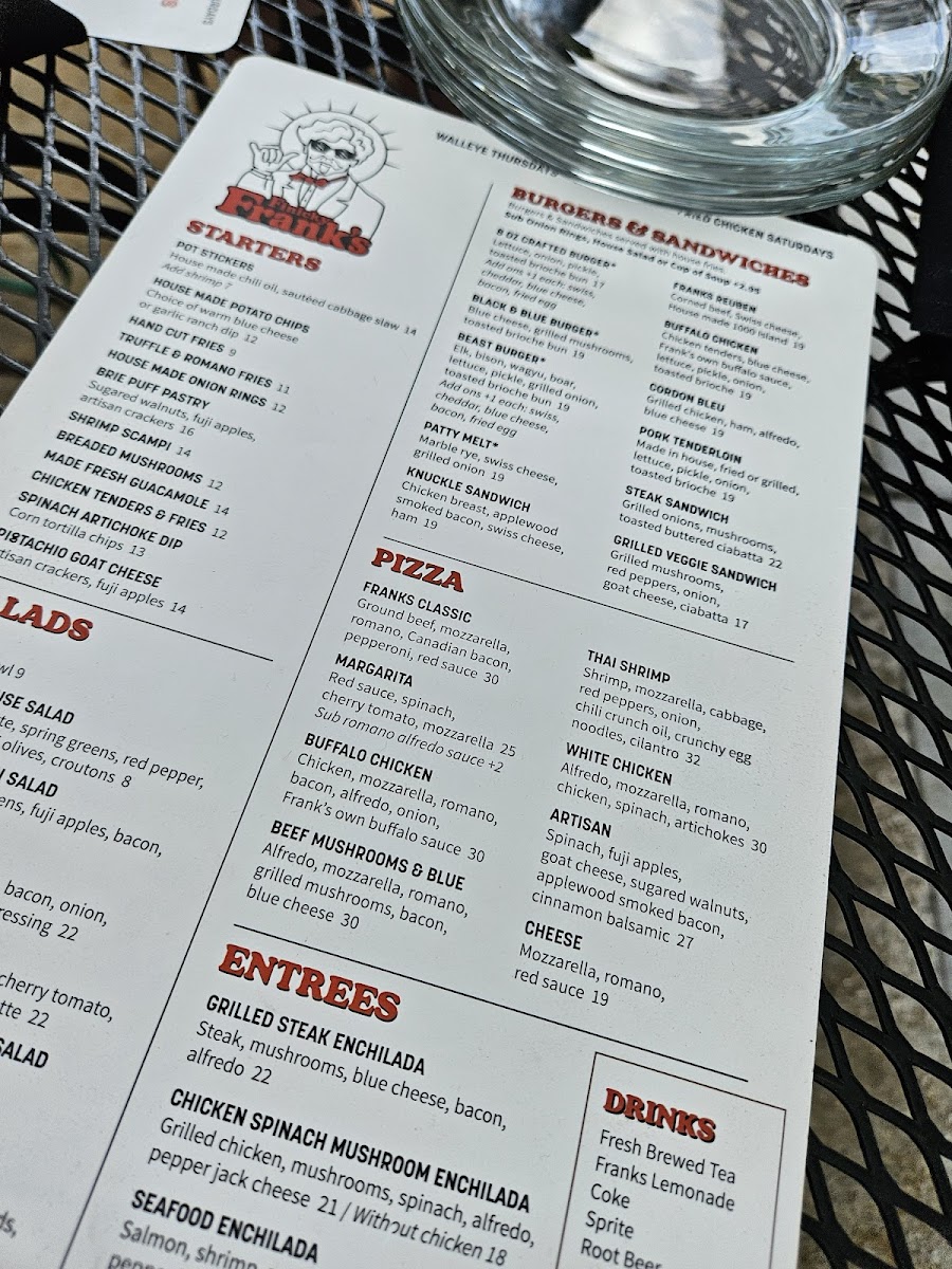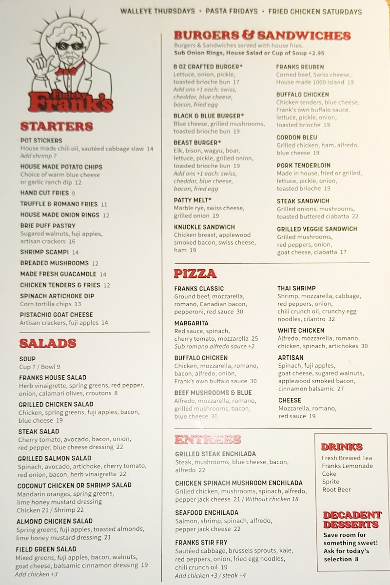 Finicky Franks boasts a menu that expertly combines classic comfort with innovative flair. Indulge your taste buds with their Alfredo Cherry Pizza, a unique twist that's both creamy and tangy, or dive into the Crab Crusted Walleye, loved by patrons for its flavorful crust that melds beautifully with tender fish beneath. Don’t miss the Grilled Steak Enchilada and Chicken Spinach Mushroom Enchilada, both bursting with rich flavors that will leave you craving more.